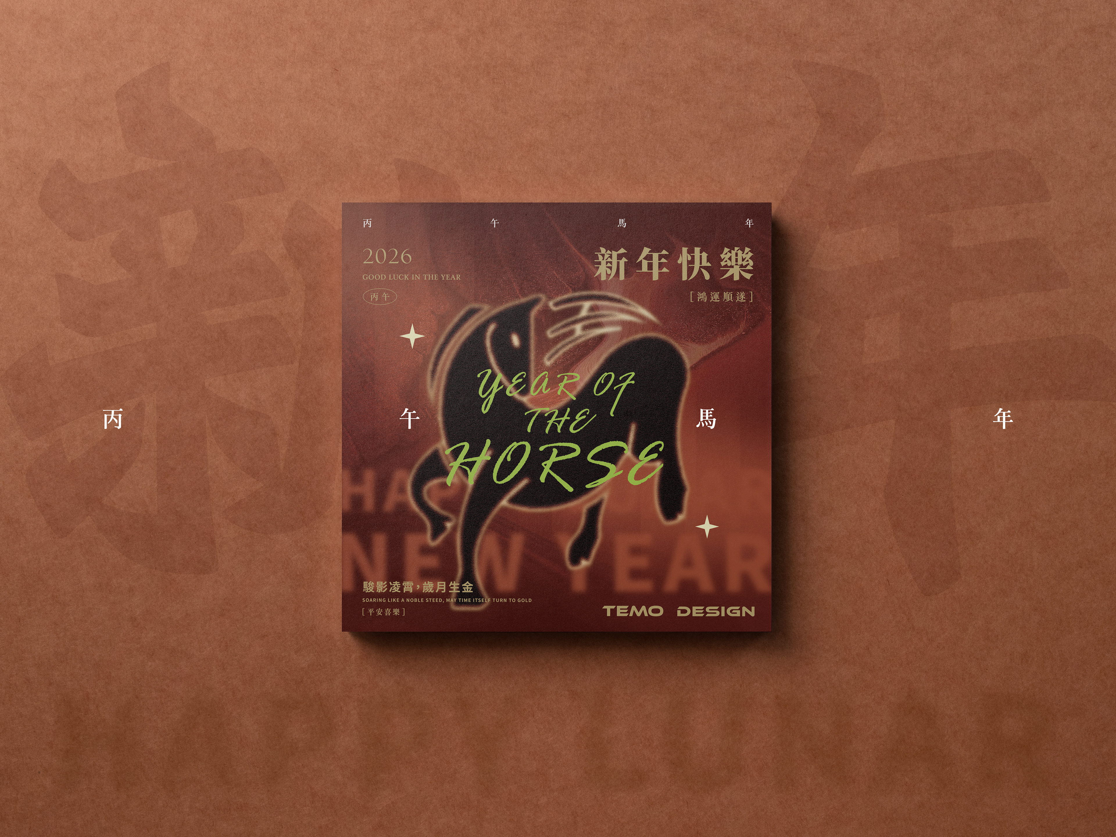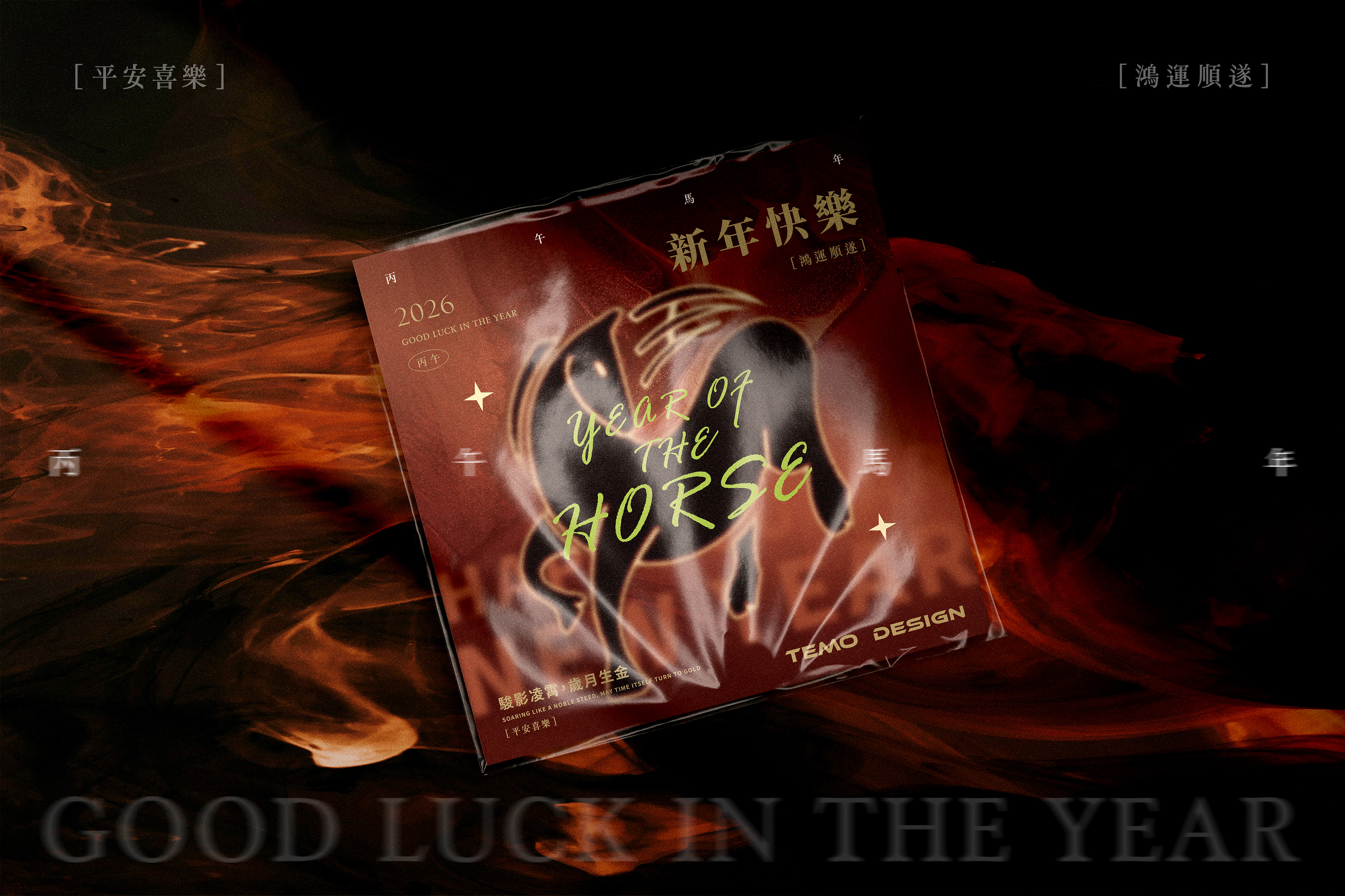 本次馬年賀卡的整體視覺,圍繞「動勢」與「文化轉譯」展開。背景以溫潤赤金色調鋪陳,象徵歲序更替與時間流轉,搭配光影層次與流動紋理,營造出如春風策動、能量湧動的氛圍。整體構圖採前傾動線,讓畫面自然形成向前奔馳的視覺張力,呼應馬年的速度與突破。