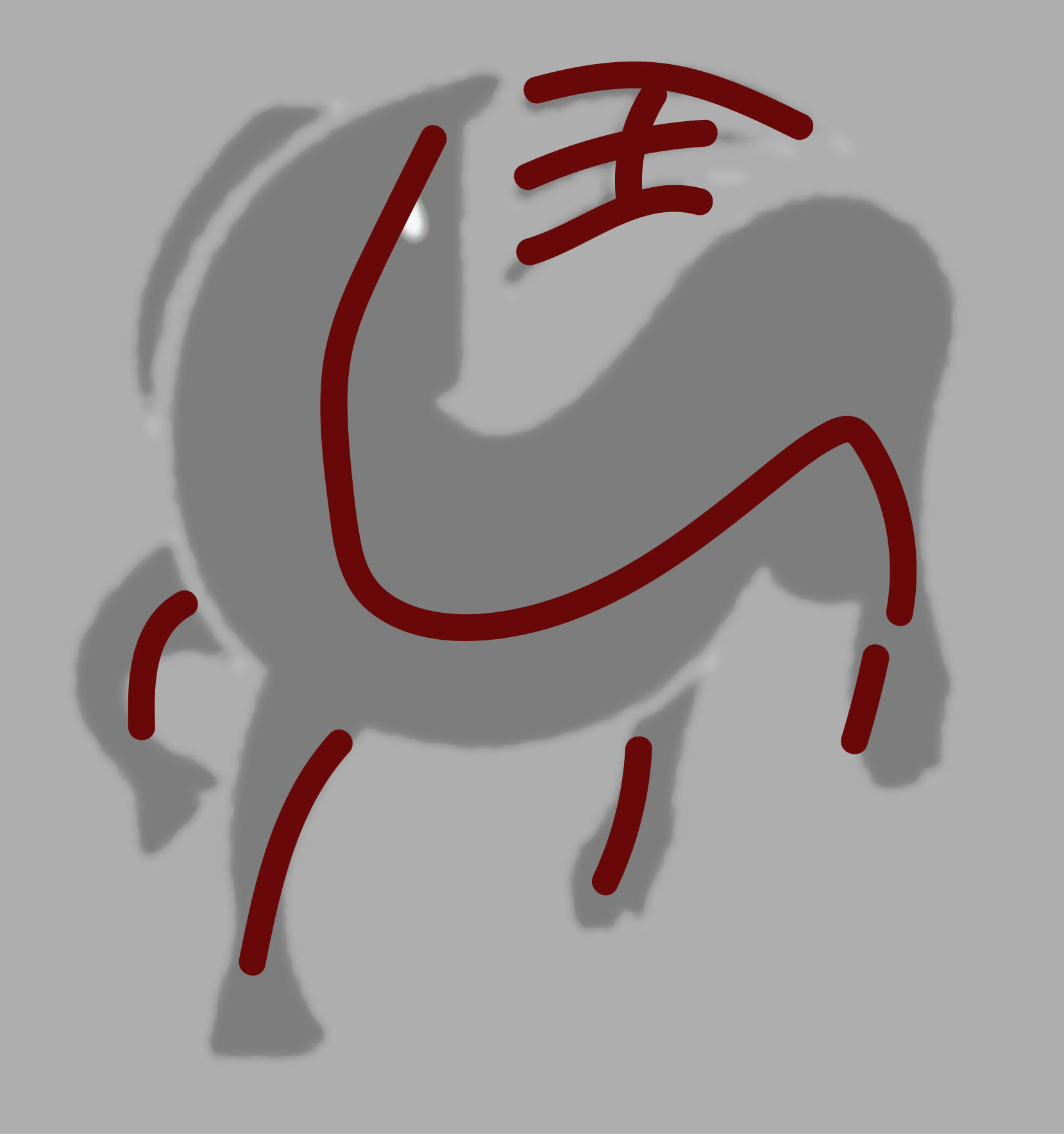 以漢字筆畫為結構基礎,將橫、豎、彎鉤等筆勢延展為鬃毛、頸線與四肢輪廓,使文字本身轉化為奔騰的形象。上方筆畫象徵鬃毛與風速線條,中段弧形形成胸膛與軀幹的力量,下方垂直筆畫則化為踏地支撐,構築出穩定而前進的姿態。