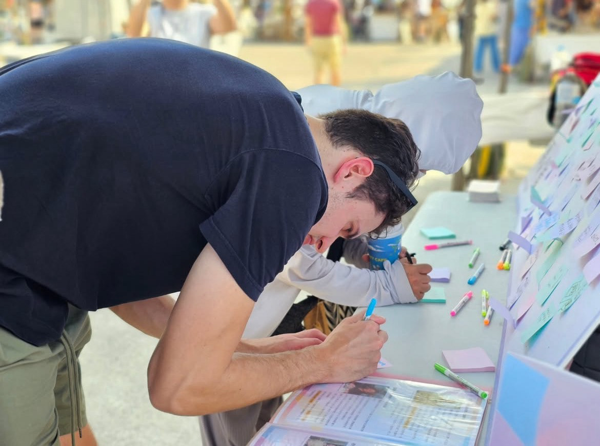 右上角以黃到藍的漸層橢圓塑造「聚光燈」,半透明圓片則擴散成舞台上空的光暈,與標題筆畫交錯,隱喻光束在「幕前/幕後」之間自由流動——只要投入專業,每個角色都能被看見、被平等對待。這也銜接活動以性別平權為核心、引導大眾理解多元價值的策畫精神;畫面中的聚光符碼亦取材自互動關卡裡的舞台象徵語彙。