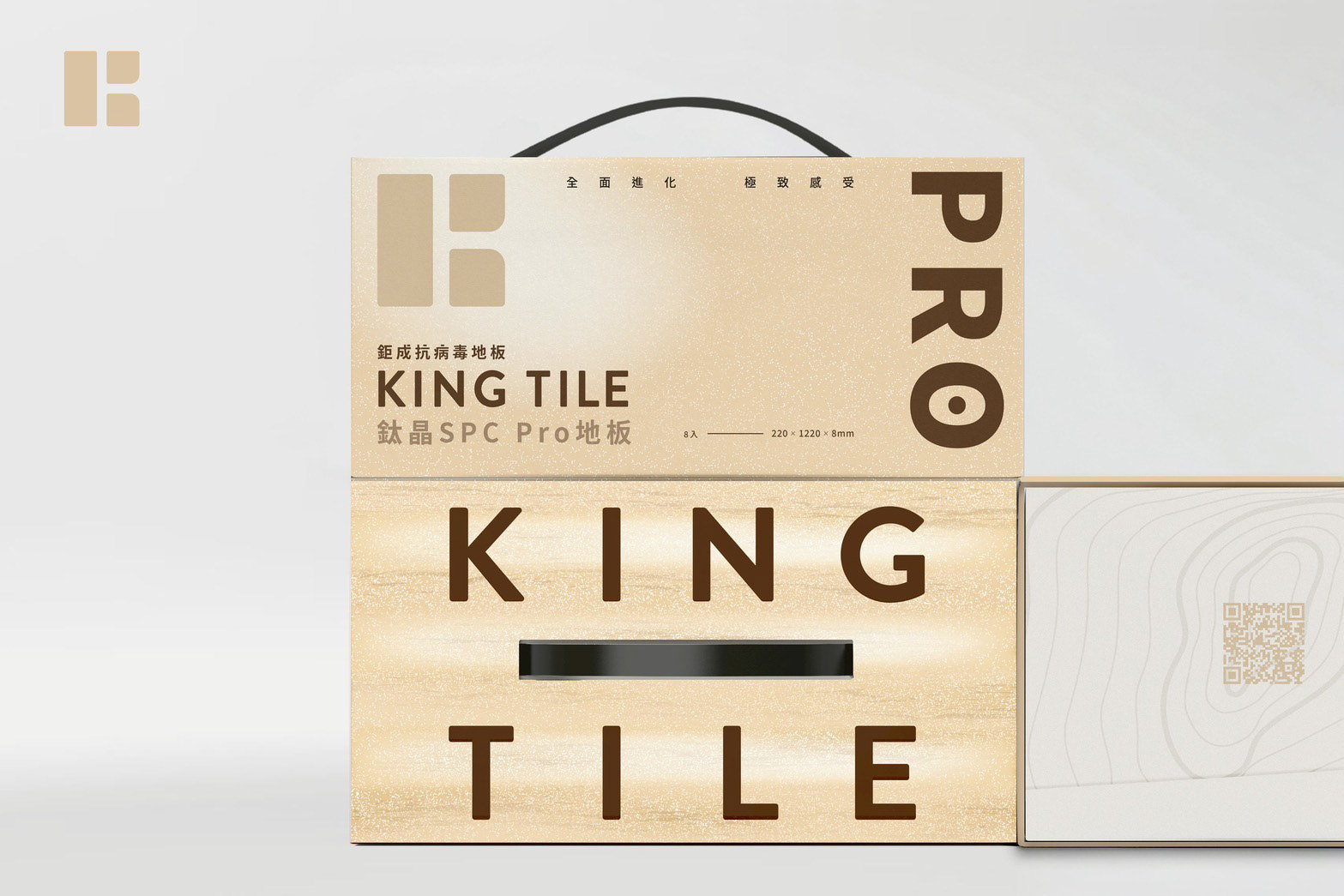 頂部延續上一版品牌名稱保有系列感,同時透過設計仿材質色階與紋理差異,清楚區分 Pro 等級;打開盒蓋的瞬間,內部以分子模糊與層次堆疊的輔助圖形營造「寶藏盒」般的儀式感,搭配專業認證如勳章般呈現,讓使用者在開箱的當下就理解:這不只是一箱地板,而是一套為居家、商空與未來生活打造的高階防護系統。側邊延續品牌一致的排版邏輯與 QR CODE 設計,整體設計以「全面進化,極致真實」為核心精神,讓鈦晶 SPC Pro 在外觀上更接近實木、在內在上更接近科技防線。