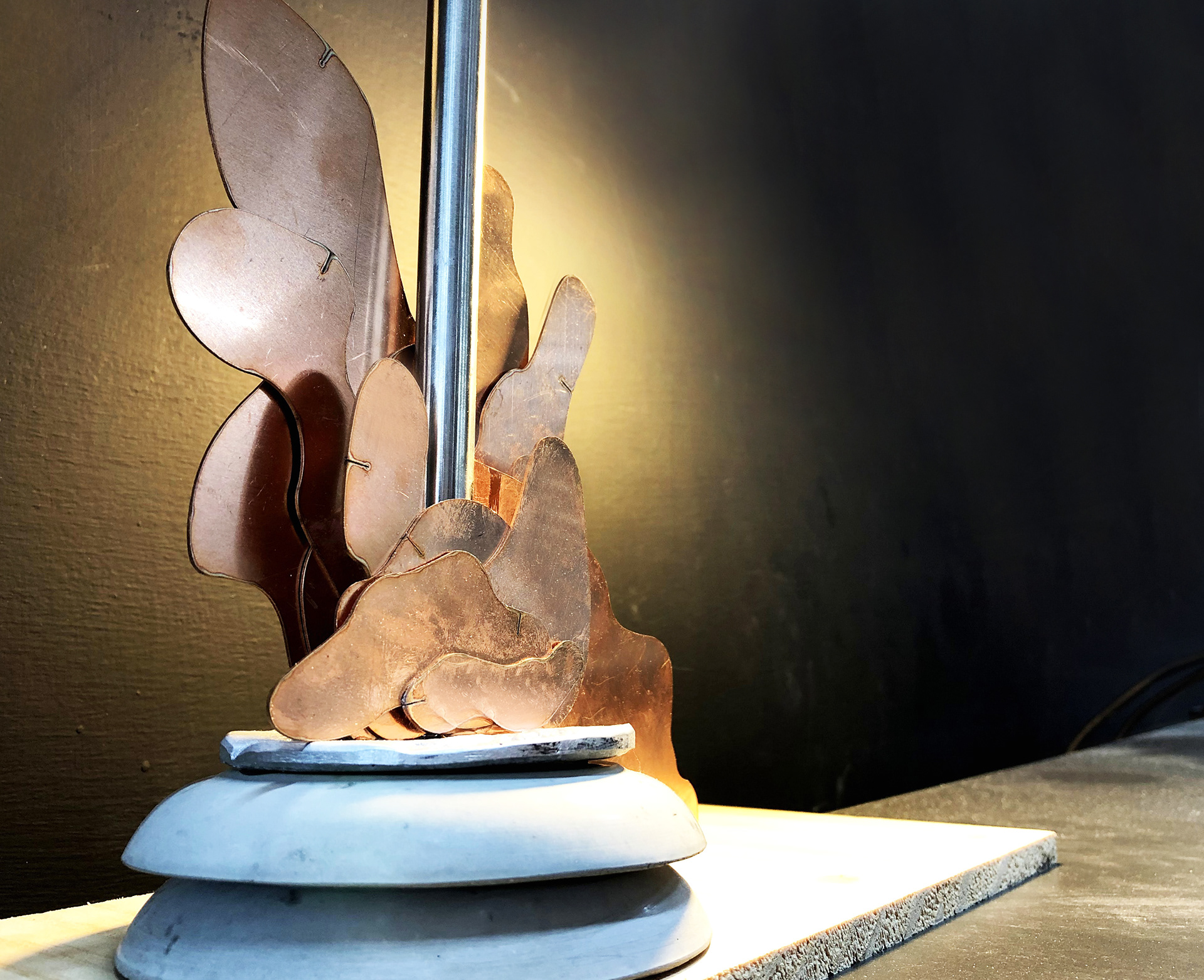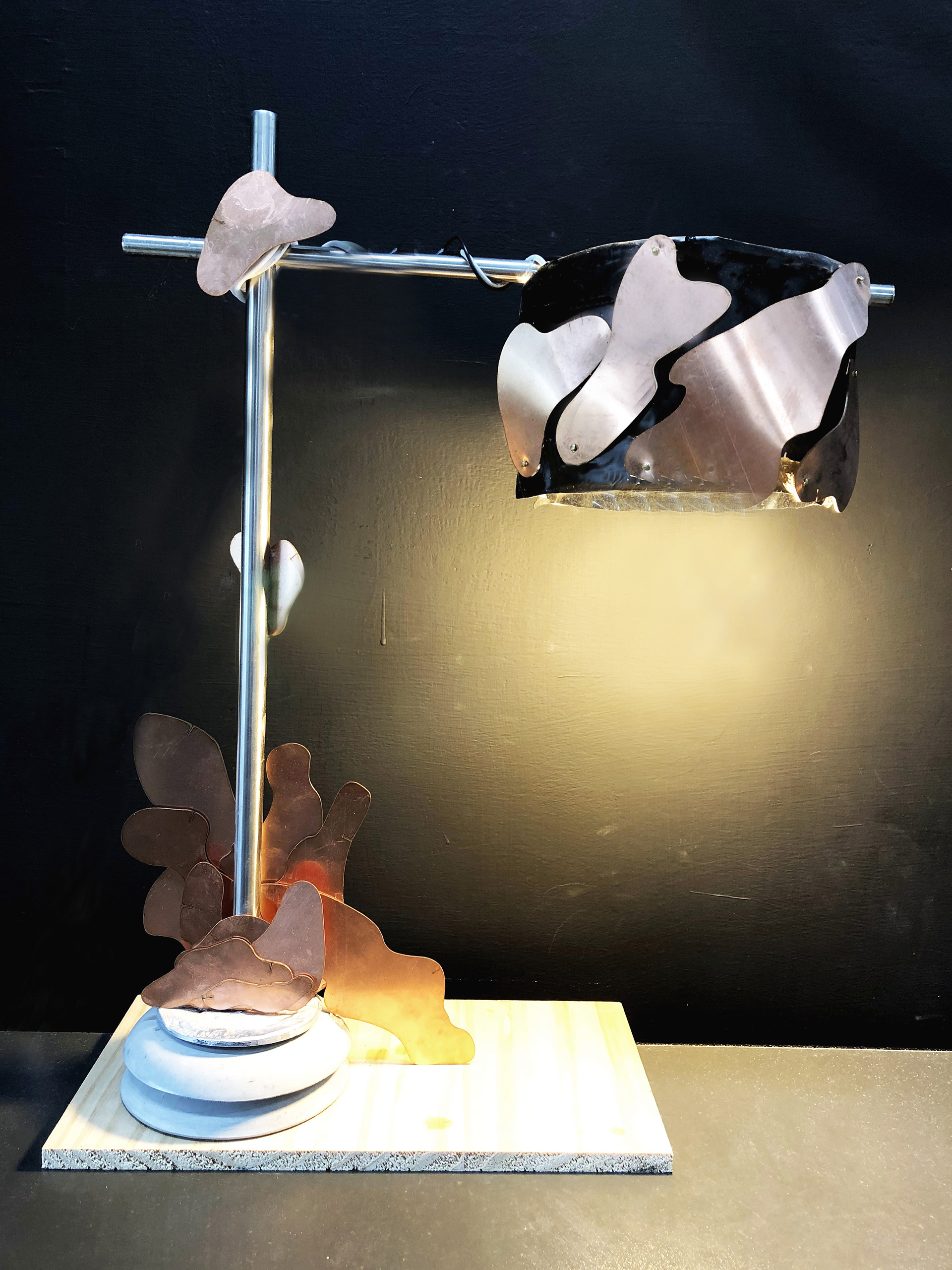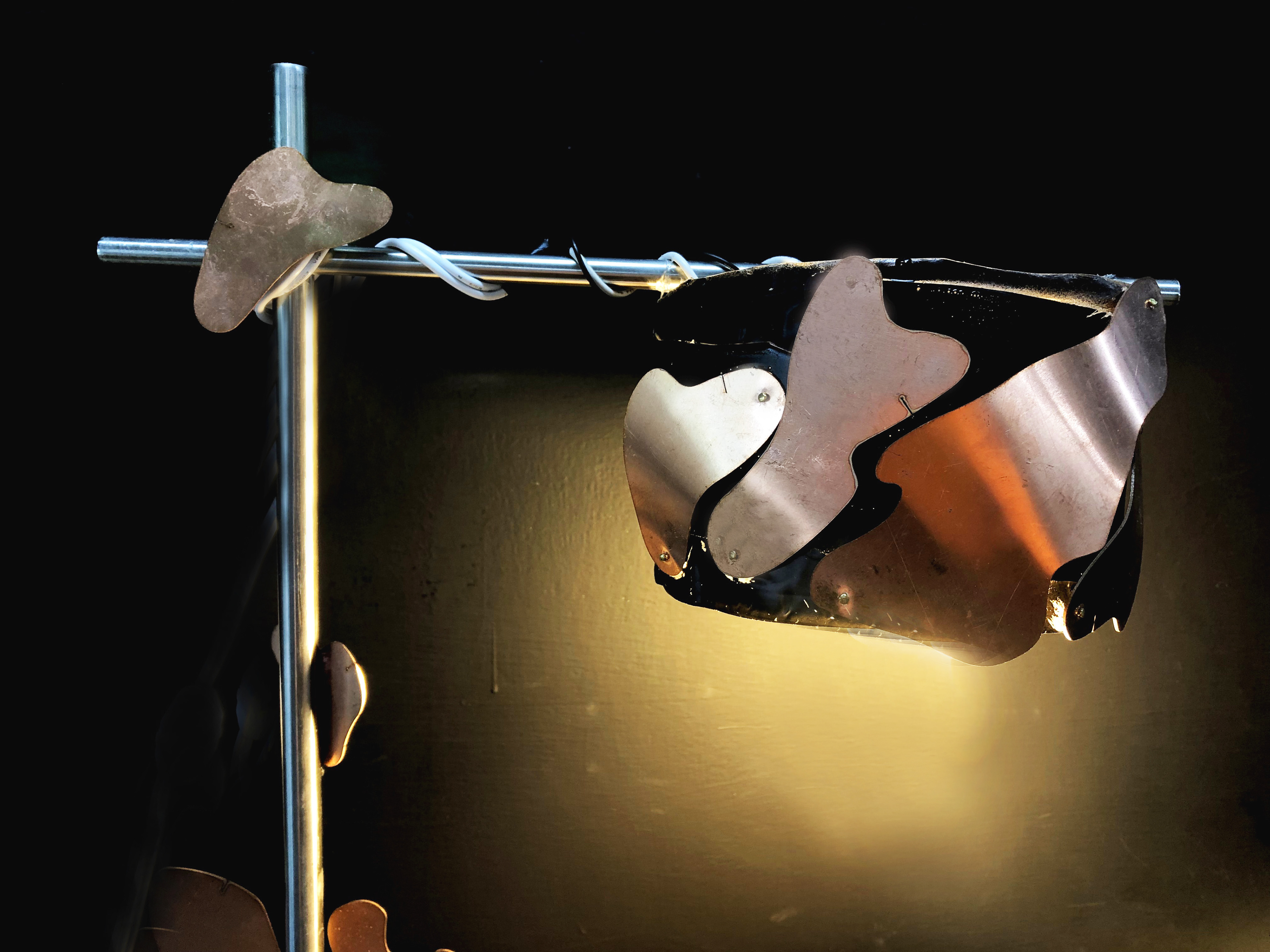 希望透過廢棄保特瓶熱塑成行的特性來進行設計發想,並且透過蒐集廢銅片及廢棄鋁罐的結合來製作成檯燈,不僅解決人類照明的問題,更能過廢金屬的有機造型及寶特瓶好塑形的特性達到人類追求獨特且快速的本性,