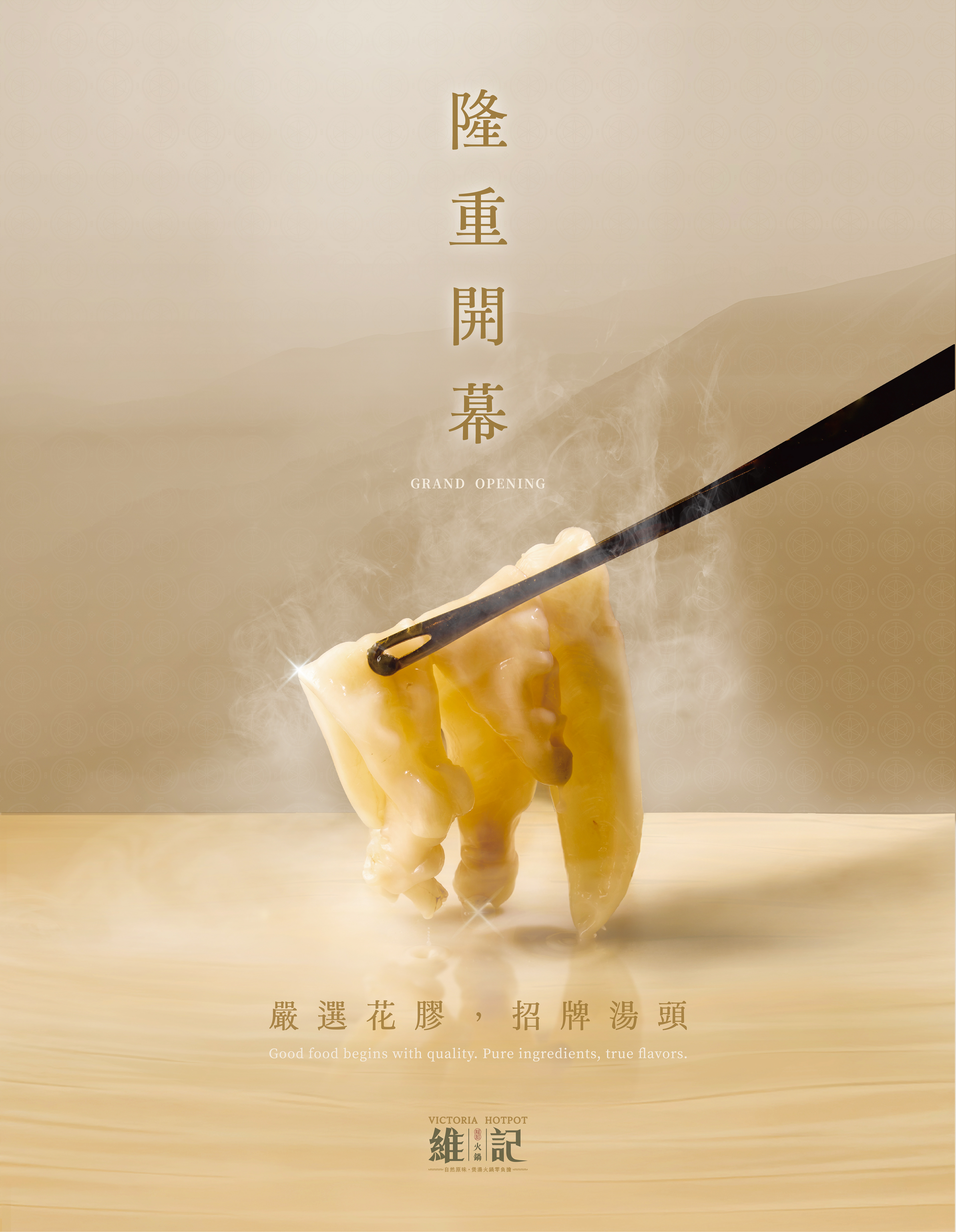 「維」字如柱,象徵守護與承載;「記」字如書,象徵留存與傳承;「火」字燃燒,代表熱度與生命力;「鍋」字盛載,象徵包容與圓滿。四字並列,不只是 品牌名稱,而是品牌精神的座標。在這裡,火鍋不只是火鍋,它是一段歷史的續寫;不只是食材的集合,它是一場生活的儀式,是職人匠心的印記, 是港味文化的縮影,更是每一位顧客與家人共享的 一鍋人情、一桌初心。