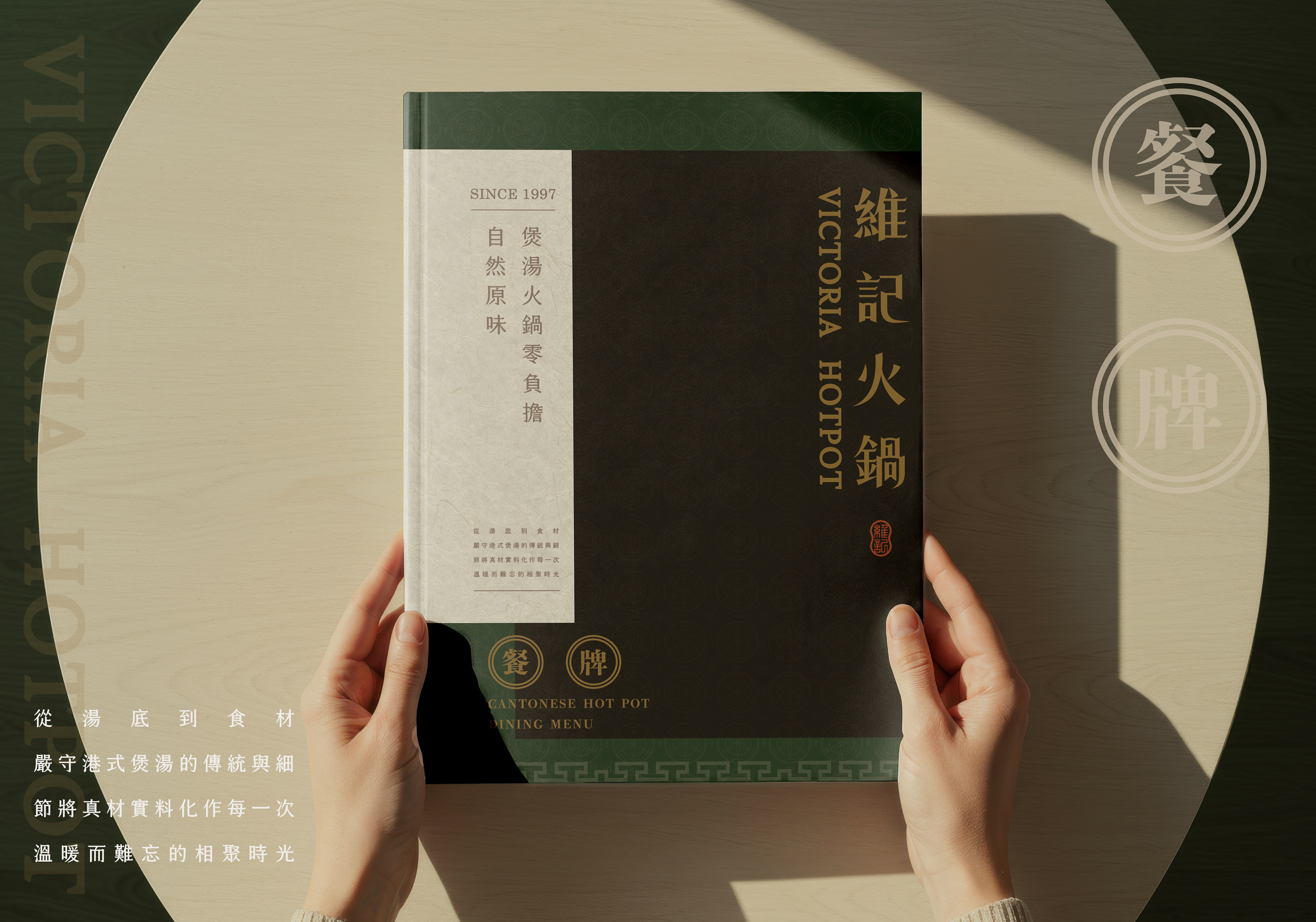 版面編排注重留白與聚焦的節奏感,以弧形構圖呼應火鍋盛裝食材的意象,使視覺重心集中,同時保有呼吸空間,讓顧客在瀏覽菜單時彷彿正被邀請進入一場視覺與味覺的饗宴。從封面到內頁,每一次翻動都是一次文化與美味的旅程,傳遞品牌對真材實料、慢火熬煮的堅持,以及對港式飲食文化的敬意與傳承,更是品牌哲學的延伸——以「自然原味,煲湯火鍋零負擔」為初心,把一盅一味的港式經典,轉化為現代餐桌上值得細細品味的高端盛宴,讓每一位顧客在翻開菜單的那刻,就已置身於溫暖而難忘的港式時光裡。